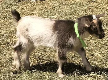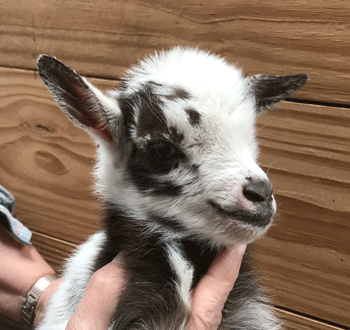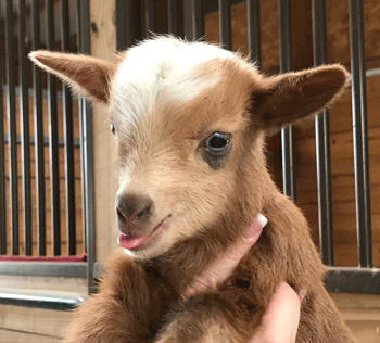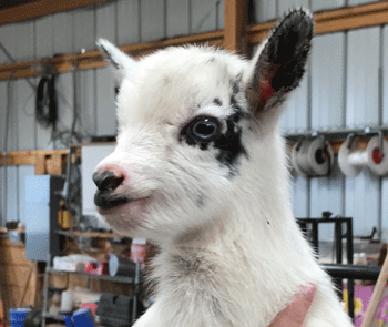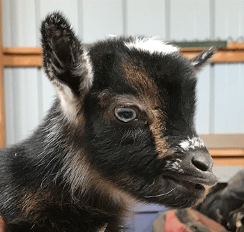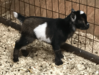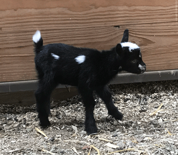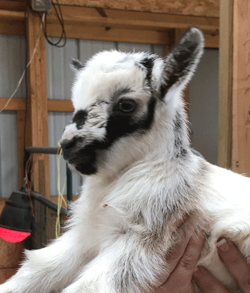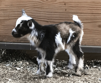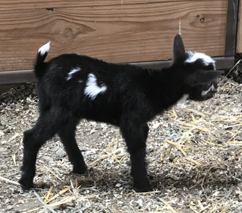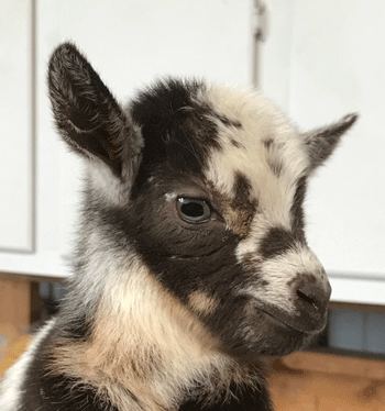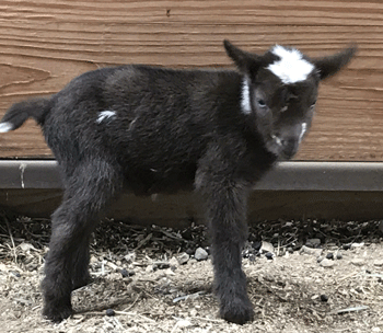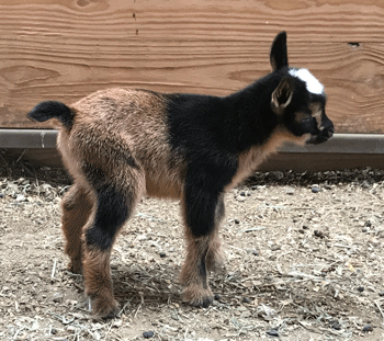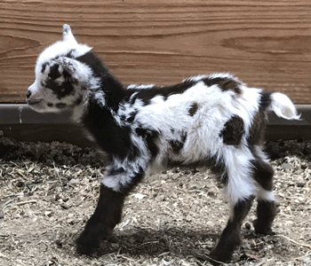 #L3 Born 5-3-19 Chocolate with White, Moonspots, and Polled It is hard to see but she is covered in Moonspots Blue Eyes Doeling